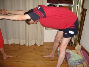Menschen mit Rückenpoblemen fällt diese Haltung sehr schwer, weil Ihnen die Dehnfähigkeit der Beine fehlt. Hier hilft leicht ins Knie zu gehen und mit den Knien zu schwingen.Das Becken selbst ist in der richtigen Haltung, wenn es leicht nach vorne schwingt.