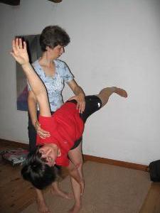 Dazu mache ich verschiedene Vorübungen um die Dehnfähigkeit der Beine, die Flexiblität des Beckens und die Kraft des Schulter- Hand-Bogens zu fördern