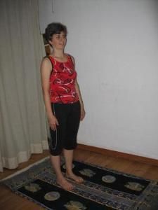 | Tadasana | Bergstellung | Arme zur Seite |  | Fehler hier: Die Schultern gehen leicht mit |  | | Gerade Füße | Gerade Beine, Knie nicht durchgestreckt | Aufgerichtetes Becken | | | | | Schultern nach hinten gerollt | Brustbein geöffnet | Weniger geöffnet | | | |